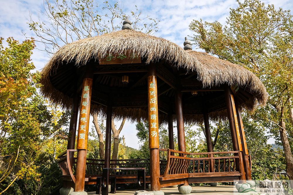 契合展區(qū)主題的樾香亭臨湖而立,雙坡屋面,八柱敞亭,柱子上書五言聯(lián)“魚樂人亦樂,泉清心共清”,盡顯悠閑舒適的情趣。在亭內(nèi)憑欄而坐,側(cè)耳聽風(fēng)雨,迎風(fēng)嗅花香。抬頭遠(yuǎn)望,荷葉亭亭的水面上,有魚兒在水中嬉戲;曲折的長橋上,游人在漫步觀景;水岸邊,銀杏、三角楓、烏桕等色彩繽紛,編織出一幅深秋的美麗畫卷。